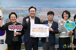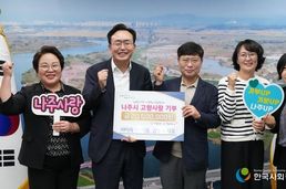 한국사회적경제신문 김태훈 기자 | 전라남도 나주시는 21일 ㈜이레가축약품 김영국 대표(사진 가운데)가 3년 연속 최고 한도액을 나주시에 고향사랑기부금으로 기탁했다고 밝혔다. ㈜이레가축약품은 나주시 세지면에서 동물의약품, 동물용 의료기기 등의 도소매 및 수출입을 통해 축산 의료 환경 개선에 힘쓰는 유수 기업이다. 김영국 대표는 고향사랑기부제가 시작된 2023년과 2024년 나주시에 당시 한도액인 500만 원을 각각 기부한 바 있으며, 한도액이 2천만 원으로 늘어난 올해에도 최고 한도액인 2천만 원을 나주시 고향사랑기부제에 기탁하는 등 3년 동안 총 3천만 원의 고향사랑기부금을 쾌척했다. 김영국 대표의 고향사랑기부제 동참에 대한 열정은 비단 나주에만 국한된 것이 아니다. 지난 7월 영암군 고향사랑기부제에 나눔을 실천했고 배우자인 황은선 이사(오른쪽 두 번째)는 지난 2월 해남군에 최고 한도액을 기부했다. 이처럼 부부가 함께 고향사랑기부제에 깊은 관심을 가지고 지역 발전과 나눔 문화 확산을 위해 적극적으로 참여해 찬사받고 있다. 이날 기탁식에는 김영국 대표와 배우자인 황은선 이사가 참석하여