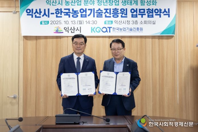 익산시는 13일 한국농업기술진흥원과 익산시청에서 '익산시 농산업 분야 청년창업 생태계 활성화'를 위한 업무협약을 체결했다.