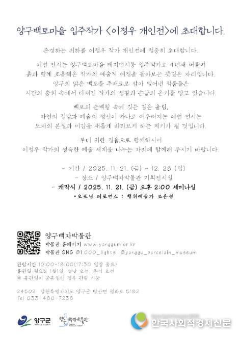 정두섭 양구백자박물관장은 “이번 전시는 흙이 만들어내는 자연의 질서와 작가의 감각이 조화롭게 어우러진 자리”라며, “이번 전시가 지역 도예문화의 창작 역량을 강화하고, 백토를 중심으로 한 양구만의 예술적 정체성을 널리 알리는 계기가 되기를 기대한다”고 말했다.