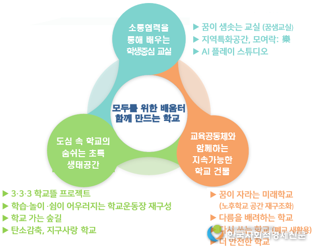 서울시교육청은 이러한 환경 변화에 대응하기 위해 ‘모두를 위한 배움터, 함께 만드는 학교’를 새로운 비전 슬로건으로 정하고, 학교 공간 혁신을 위한 3대 핵심전략과 11개 세부사업을 제시했다. 핵심전략은 △소통과 협력 중심의 학생중심 교실 조성 △교육공동체가 함께 만드는 지속가능한 학교 건물 구축 △도심 속 초록 생태환경 조성 등으로 구성됐다. 이는 단순한 시설 개선을 넘어 학교의 역할을 지역사회로 확장하고 교육공동체의 참여를 강화하겠다는 방향성을 담고 있다.