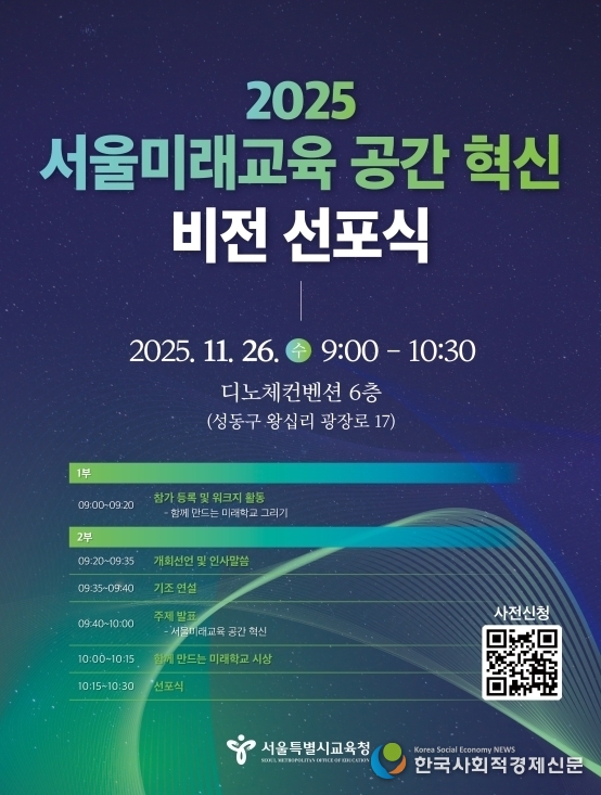 서울시교육청(교육감 정근식)이 26일 성동구 디노체컨벤션에서 ‘서울미래교육 공간 혁신 비전 선포식’을 열고 미래형 학교 공간 조성을 위한 비전과 핵심정책을 공식 발표했다. 이번 행사는 서울교육이 직면한 공간적 한계를 넘어 교육공동체와 함께 새로운 학교 모델을 만들어가겠다는 의지를 담았다.