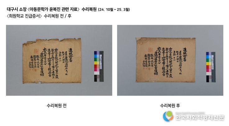 대구시(문화유산과) 소장 〈아동문학가 윤복진 관련 자료〉는 가요곡집과 졸업앨범 등 지역을 대표한 작가의 활동과 우리나라 동요사를 재조명하는 자료로 중요성을 인정받는 문화유산이었지만, 근대기 제작된 종이 수급이 어려워 수리복원에 많은 난항을 겪었다. 이에 대구간송미술관 수리복원팀은 자료와 유사한 종이를 직접 제작하여 결손부 보완 및 낙장 부분에 적용했고, 주변부와 유사한 색으로 색맞춤했다. 수리복원이 완료된 자료들은 지난 5월 대구예술발전소에서 개최된 전시 ‘수리복원, 기억을 잇다’를 통해 소개되며, 지역 출신 아동문학가 윤복진을 재조명하는 계기를 마련했다.