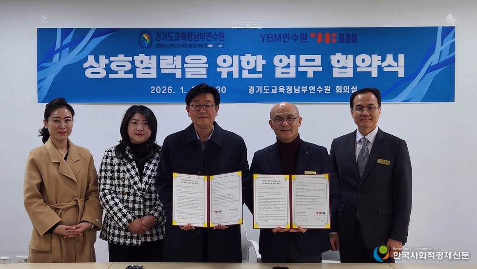 경기도교육청남부연수원이 교원 연수의 질적 수준을 높이고 운영 효율을 강화하기 위해 YBM연수원과 손을 잡았다. 남부연수원은 8일 연수원에서 YBM연수원과 업무협약을 체결하고, 인적·물적 자원 공유를 바탕으로 지속 가능한 연수 협력 모델을 구축하기로 했다.
