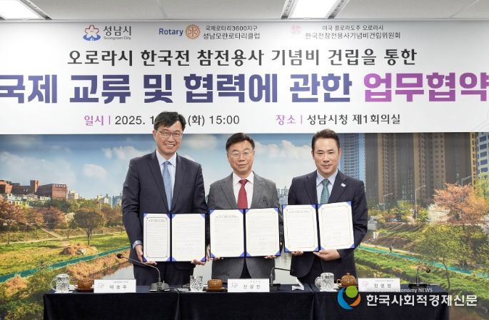 시는 10월 21일 오후 3시 시청 4층 제1회의실에서 신상진 성남시장과 한영현 국제로타리3600지구 성남모란로타리클럽 회장, 이승우 미국 오로라시 한국전참전용사기념비건립위원회 이사장 등 9명이 참석한 가운데 ‘오로라시 한국전 참전용사 기념비 건립을 통한 국제 교류 및 협력 업무에 관한 협약’을 체결했다.