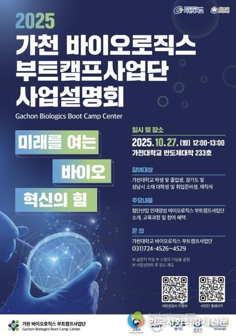 이번 설명회에서는 ‘가천 바이오로직스 부트캠프 사업단’의 운영 방향, 교육과정, 모집 절차, 참여 혜택 등이 소개된다. 특히 바이오·헬스케어 분야에 관심 있는 가천대학교 재학생 및 졸업생을 비롯해, 경기도 및 성남시 소재 대학생·취업준비생·재직자 등 누구나 참여할 수 있다.