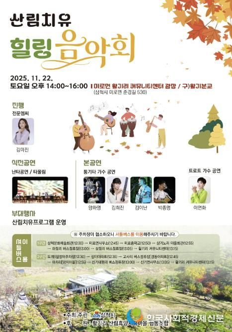 한국사회적경제신문 기자 | 삼척시는 11월 22일 토요일 오후 2시부터 삼척활기 커뮤니티센터(미로면 준경길 530) 잔디광장에서 ‘산림치유 힐링 음악회’를 연다.