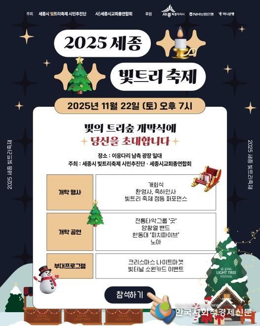이번 축제를 준비하는 빛트리 축제 시민추진단 임인택 상임대표는 “세종 시민과 교회, 지역 공동체가 함께 만들어가는 빛트리축제가 세종의 겨울을 대표하는 축제로 자리 잡아가고 있다”며, “연말까지 가족과 이웃이 함께 따뜻함을 나누는 시간이 되길 바란다”고 말했다.