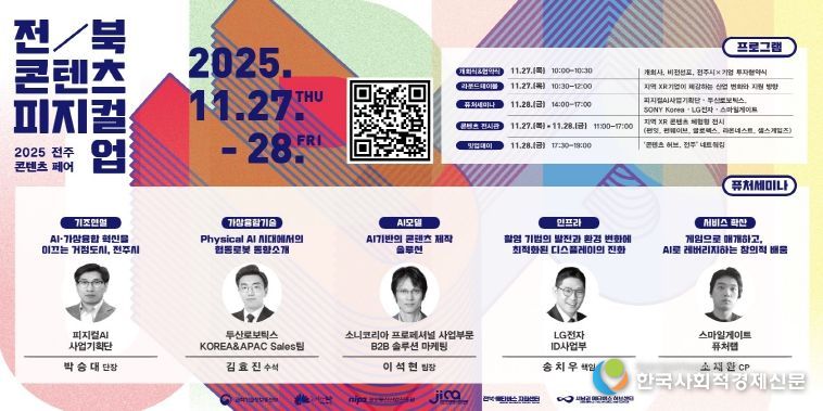 전주시와 과학기술정보통신부, 정보통신산업진흥원(NIPA), 전주정보문화산업진흥원은 오는 27일과 28일 이틀간 전주정보문화산업진흥원 일원에서 가상융합산업 성과공유회인 ‘2025년 제8회 전주 콘텐츠 페어’를 개최한다.