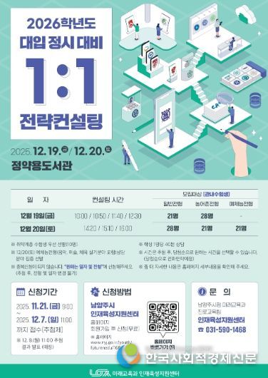 한국사회적경제신문 기자 | 남양주시는 11월 21일부터 12월 7일까지 ‘2026학년도 대입 정시 대비 1:1 전략컨설팅’에 참여할 관내 수험생을 모집한다.