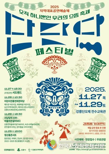 한국사회적경제신문 기자 | (사)강릉단오제위원회는 오는 11월 27일부터 29일까지 강릉단오제전수교육관 일원에서 ‘2025 단단단페스티벌’을 개최한다고 밝혔다. ‘단단단(端單團)’은 으뜸 단(端), 오직 하나 단(單), 우리 단(團)을 뜻하며 “오직 하나뿐인 우리의 으뜸 축제”를 의미한다.
