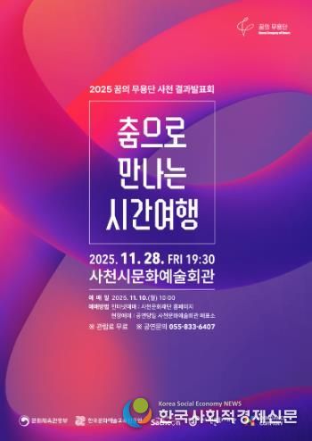 한국사회적경제신문 기자 | 사천문화재단은 오는 11월 28일 오후 7시 30분, 사천시문화예술회관 대공연장에서 ‘2025 꿈의 무용단 사천’ 결과발표회 '춤으로 만나는 시간여행'을 개최한다.