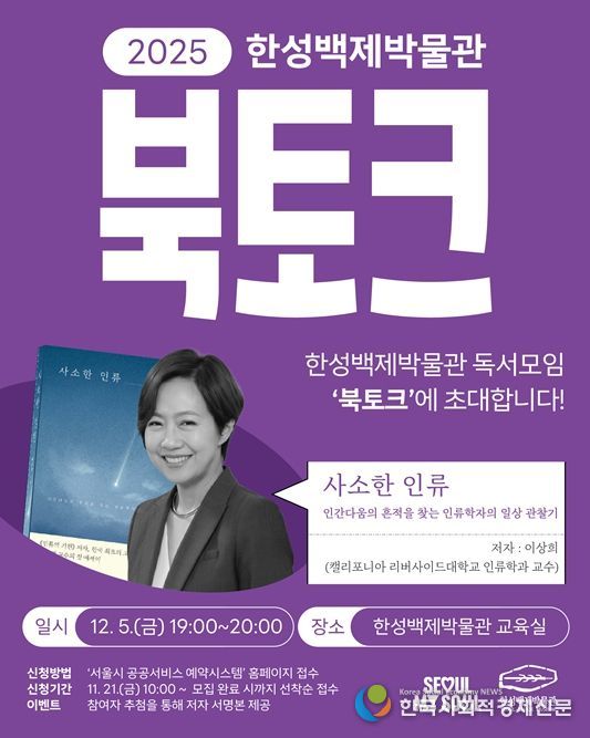 한국사회적경제신문 기자 | 서울시 한성백제박물관은 올해 두 차례 운영된 역사독서모임 ‘북토크’를 12월 5일에 추가 개최한다고 밝혔다. 당초 연 2회 운영했으나 높은 시민 호응에 힘입어 추가 편성을 결정한 것이다. 이번 행사는 서울시 대표 야간문화 프로그램 ‘문화로 야금야금(夜金)’의 일환으로, 금요일 밤 박물관에서 역사학·고고학 분야 저자와 시민이 직접 소통할 수 있는 자리로 마련됐다.