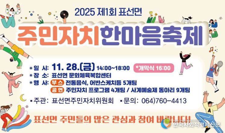 한국사회적경제신문 기자 | 서귀포시 표선면은 28일 표선면 문화체육복합센터 일원에서 ‘2025 제1회 표선면 주민자치 한마음축제’를 개최한다. 올해 처음으로 진행하는 이번 축제는 표선면 주민자치 프로그램의 1년 활동을 공유하고, 다양한 체험·공연을 통해 주민 간 소통과 화합을 도모하기 위해 마련됐다.