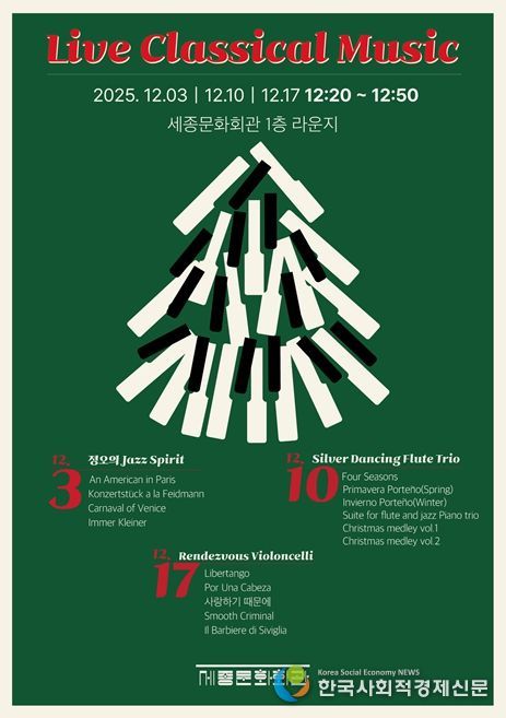 한국사회적경제신문 기자 | 서울시 세종문화회관은 12월 3일부터 17일까지 매주 수요일 오후 12시 세종라운지에서 2025 겨울 ‘수요라운지음악회’를 개최한다. ‘수요라운지음악회’는 점심시간 30분 동안 누구나 편안하게 음악 연주를 즐길 수 있도록 기획됐다.