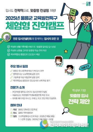 이어 29일부터 30일에는 울릉고 1~2학년, 울릉중 3학년 중 사전 신청 학생을 대상으로 일대일 맞춤형 입시컨설팅이 제공된다. 상담을 통해 학생들은 변화하는 대입제도에 맞춘 개별 학업·진로 설계를 체계적으로 지원받을 수 있게 된다.
