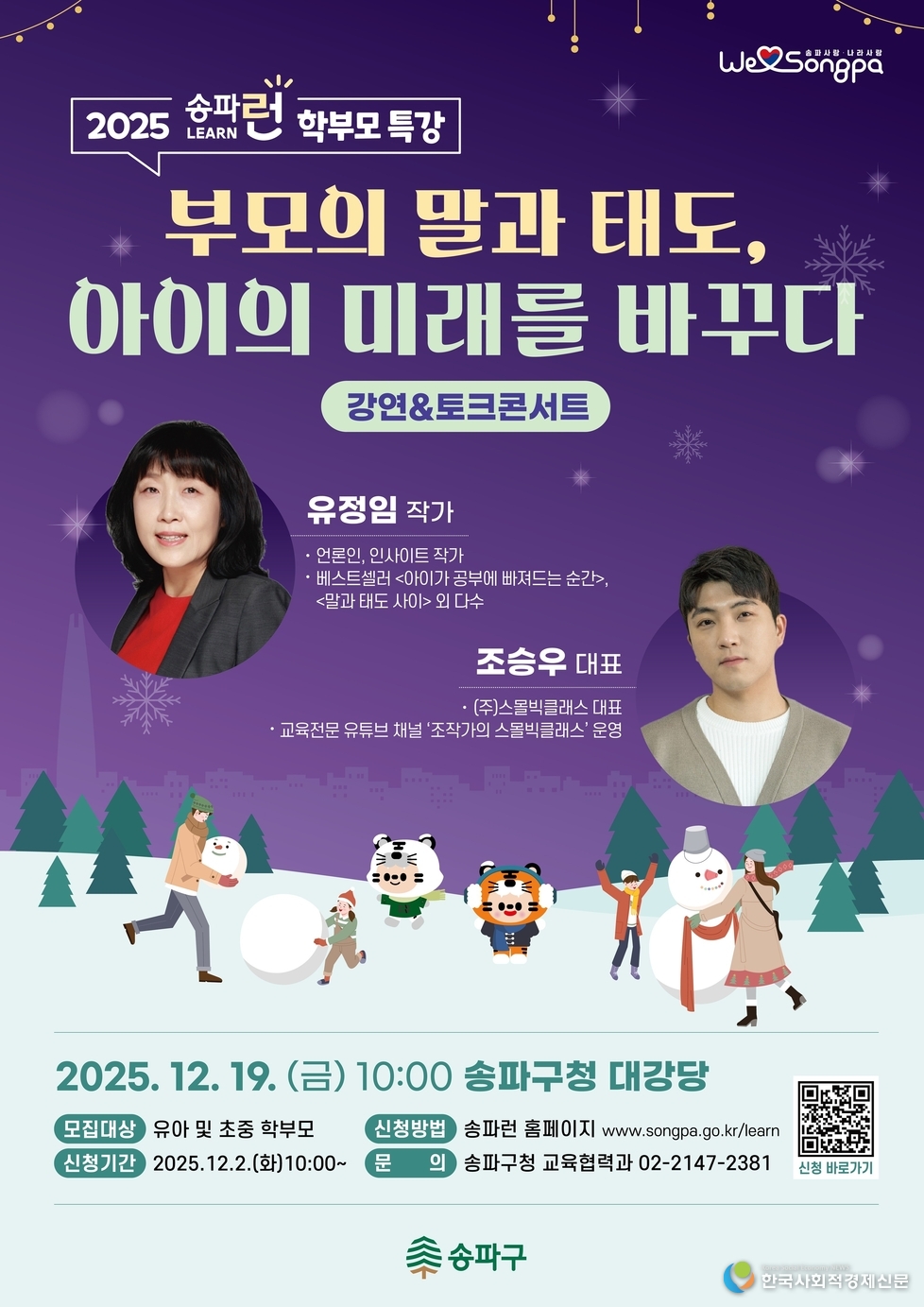 서울 송파구가 연말을 맞아 학부모들의 교육 고민을 함께 나누는 자리를 마련했다. 구는 오는 12월 19일 오전 10시 구청 4층 대강당에서 올해 마지막 학부모 특강 ‘부모의 말과 태도, 아이의 미래를 바꾸다’를 개최한다고 밝혔다. 이번 행사는 학부모들이 가장 궁금해하는 자녀 교육법을 보다 깊고 현실적으로 다루기 위해 강연과 토크콘서트를 결합한 형식으로 기획됐다.