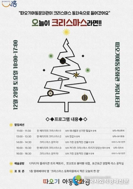한국사회적경제신문 기자 | 시흥시 따오기아동문화관이 오는 12월 20일 크리스마스 문화행사 ‘오늘이 크리스마스라면’을 연다. 반짝이는 트리, 서늘한 겨울 공기, 책장을 넘기는 소리가 한데 어우러지며 문화관은 잠시 ‘이야기가 살아 움직이는 공간’으로 변한다.