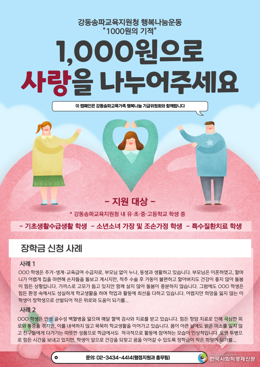 ‘천원의 기적’은 강동송파교육가족 행복나눔운동 위원회가 2010년부터 15년간 이어온 대표적 교육복지 캠페인이다. 경제적 어려움으로 학업과 생활에 부담을 겪는 학생과 특수질환을 앓는 학생을 돕기 위해 마련됐으며, 지원청과 관내 학교 교직원들의 꾸준한 참여로 기금이 조성되고 있다.