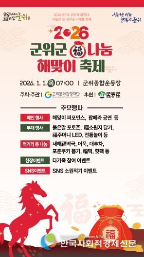 한국사회적경제신문 기자 | 대구광역시 군위군은 다가오는 2026년 병오년(丙午年) 새해를 맞아 군민의 행복과 안녕을 기원하는 '2026 군위군 복나눔 해맞이 축제'를 오는 1월 1일 오전 7시부터 군위종합운동장에서 개최한다.