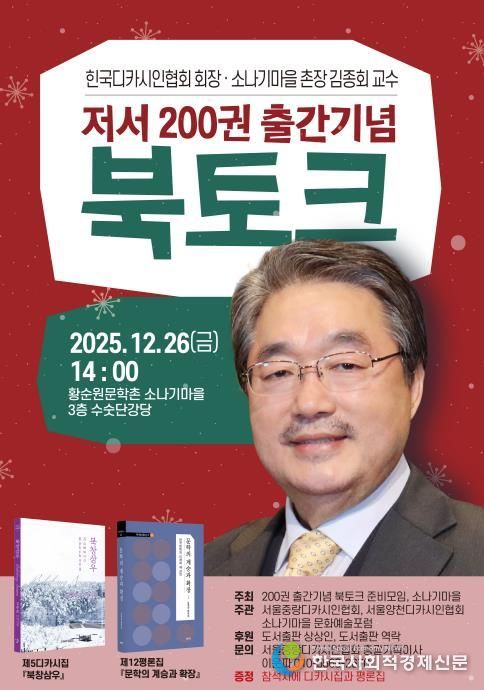 한국사회적경제신문 기자 | 황순원문학촌 소나기마을은 오는 26일 오후 2시, 김종회 촌장의 저서 200권 출간을 기념해 북토크를 개최한다고 밝혔다. 이번 행사는 양평군 서종면 소나기마을 수숫단강당 3층에서 열리며, 서울중랑디카시인협회와 서울양천디카시인협회, 소나기마을 문화예술포럼이 주관하고 200권출간기념북토크준비모임과 소나기마을이 주최한다.