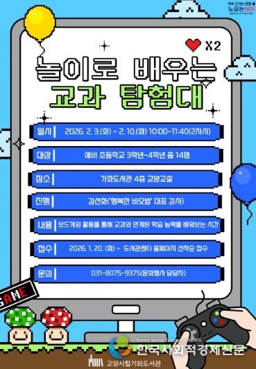 한국사회적경제신문 기자 | 고양특례시 가좌도서관은 2월 3일부터 방학특강 프로그램 ‘놀이로 배우는 교과 탐험대’을 운영한다.