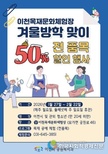 한국사회적경제신문 기자 | 이천시는 겨울방학을 맞아 어린이 및 청소년들에게 특별한 체험 기회를 제공하기 위해 목재문화체험장 이용료를 50% 할인하는 행사를 진행한다고 밝혔다.