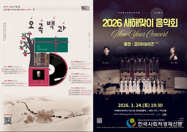 대표 프로그램으로는 오는 24일 오후 7시 30분, 도서관 1층 계단형 관람석에서 열리는 ‘2026 새해맞이 음악회’가 있다. 음악회에는 코리아싱어즈 합창단, 오카리나 연주자 김욱, 클라리네티스트 김예원 등이 출연해 새해의 희망을 전하는 공연을 선보인다.