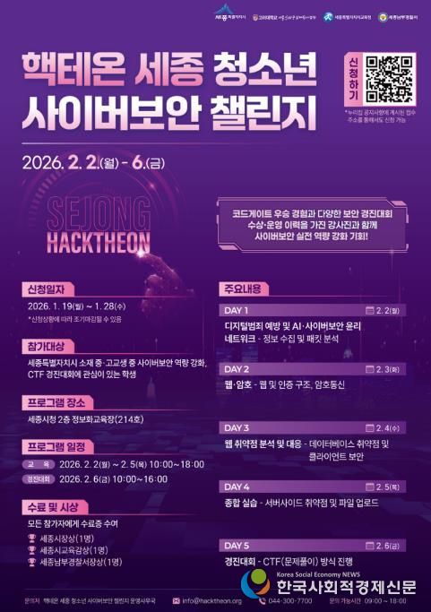 세종특별자치시는 오는 28일까지 관내 중고등학생을 대상으로 핵테온 세종 청소년 사이버보안 챌린지 참가자를 모집한다고 밝혔다.