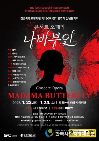 한국사회적경제신문 기자 | 강릉시립교향악단은 2026년의 첫 정기연주회로 오는 23일(금) 19시 30분, 24일(토) 17시 강릉아트센터 사임당홀에서 콘서트 오페라‘나비부인’을 선보인다.