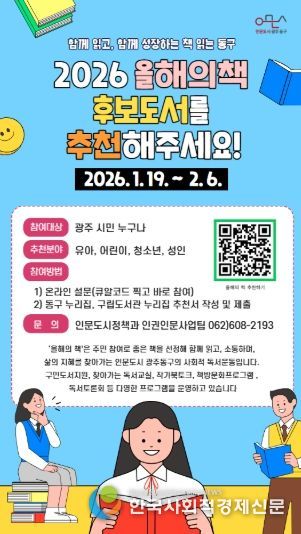 한국사회적경제신문 기자 | 광주 동구는 한 해 동안 시민과 함께 읽을 2026년 ‘책 읽는 동구 올해의 책’ 선정을 위해 후보 도서 추천을 오는 2월 6일까지 접수한다고 밝혔다.