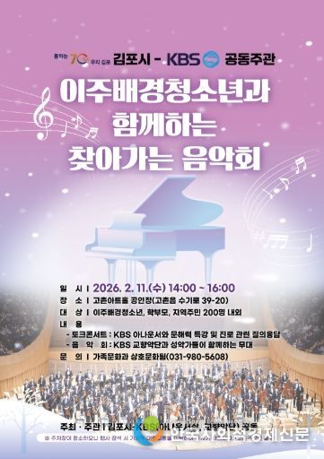한국사회적경제신문 기자 | 김포시가 오는 2월 11일 오후 2시부터 4시까지 김포시와 KBS가 공동주관으로 고촌아트홀 공연장(연주홀)에서 『이주배경청소년과 함께하는 찾아가는 음악회』를 개최한다고 밝혔다.