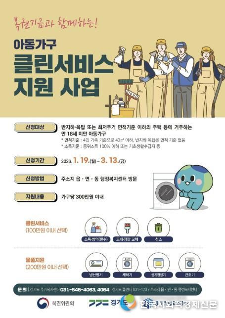 한국사회적경제신문 황인규 기자 | 성남시는 주거환경이 열악한 곳에 거주하는 아동의 주거환경과 위생 여건을 개선하기 위해 복권기금과 함께 추진하는 ‘아동가구 클린서비스 지원사업’의 대상 가구를 모집한다.