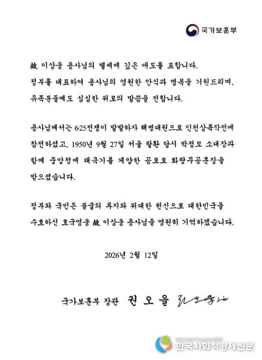 한국사회적경제신문 claire-shin 기자 | 6‧25전쟁이 한창이던 1950년 9월, 아군의 서울수복 당시 박정모 소대장과 함께 중앙청에 태극기를 게양했던 이상웅 참전용사가 별세함에 따라 권오을 국가보훈부 장관이 13일 조전을 보내 “호국영웅을 영원히 기억하겠다”며 고인의 명복을 빌었다.