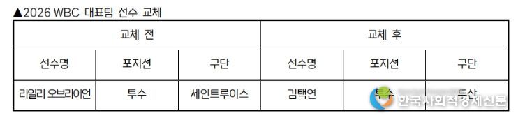 한국사회적경제신문 claire-shin 기자 | KBO 전력강화위원회는 부상으로 인해 WBC 참가가 어려워진 세인트루이스 라일리 오브라이언을 대체할 선수로 두산 김택연을 확정하고 WBC 조직위에 선수 교체 승인을 요청했다.