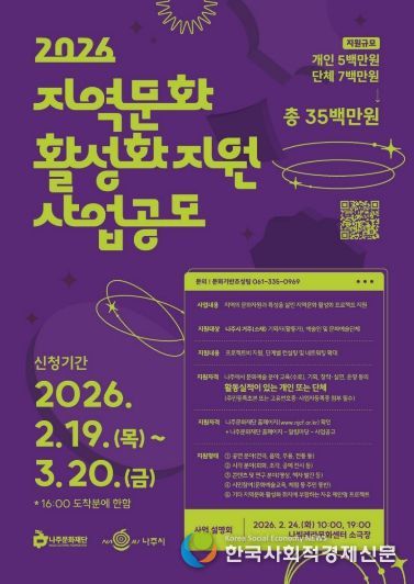 나주문화재단은 ‘2026 지역문화 활성화 지원사업’ 공모를 오는 3월 20일 오후 4시까지 진행한다고 19일 밝혔다.