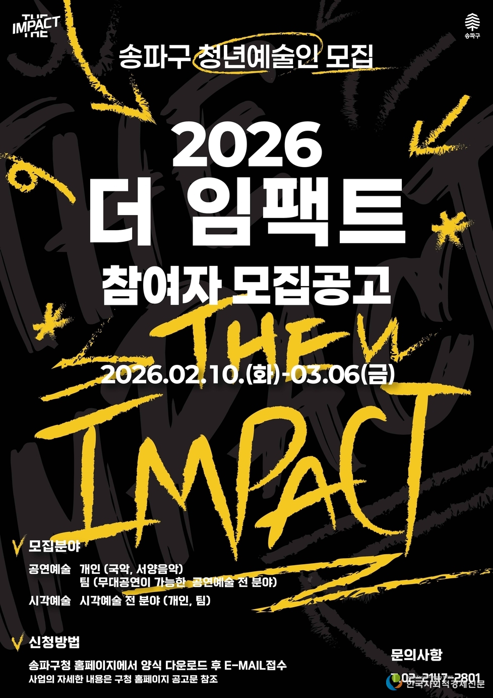 서울 송파구가 청년예술인 발굴·지원 사업 ‘2026 더 임팩트’ 참가자를 오는 3월 6일 오후 5시까지 모집하고 있다. 접수는 지난 2월 10일부터 시작됐다.