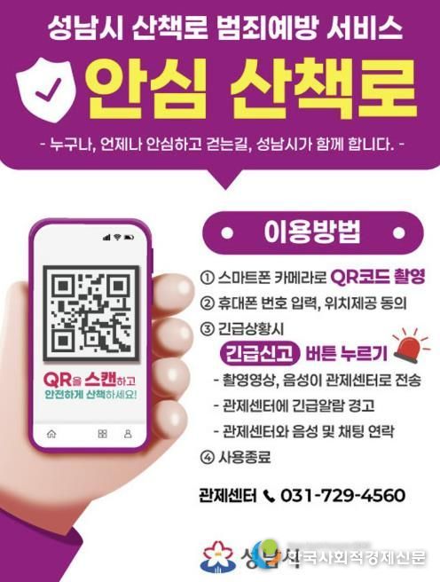 한국사회적경제신문 황인규 기자 | 성남시는 시민들이 보다 안심하고 산책로를 이용할 수 있도록 영장산과 불곡산 일대 산책로에 ‘범죄예방 서비스’를 6일부터 도입한다.