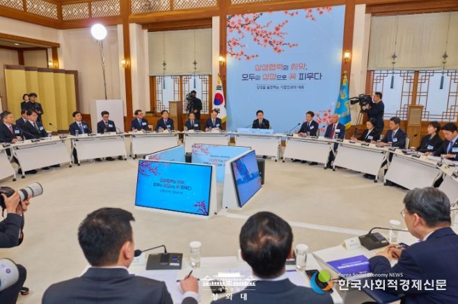 이 대통령은 이날 청와대에서 '상생협력의 씨앗, 모두의 성장으로 꽃 피우다'라는 주제로 열린 '상생을 실천하는 기업인과의 대화' 모두발언에서 "우리가 지속적 성장을 계속하기 위해 가장 중요한 것이 상생의 생태계 조성이라 생각한다"며 이 같이 말했다.
