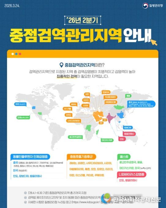 한국사회적경제신문 claire-shin 기자 | 질병관리청은 해외감염병 발생 동향과 위험평가를 바탕으로 2분기 중점검역관리지역과 검역관리지역을 지정·해제하고, 4월 1일 자로 시행한다.