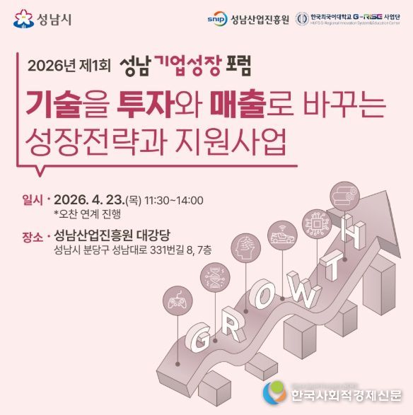 한국사회적경제신문 황인규 기자 | 성남산업진흥원은 4월 23일 11시 30분부터 성남산업진흥원 대강당에서 '2026년 제1회 성남기업성장포럼'을 개최한다. 이번 행사는 기술 기반 투자유치와 중동사태 대응 방안을 중심으로 성남 기업의 매출 성장과 글로벌 진출을 모색한다.