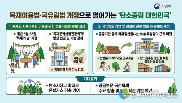이번 법률 개정은 목재산업·문화 확산을 위한 정책을 강화하고, 국산 목재 수요 창출 효과를 이끌어 탄소저장고를 확대하고 국가 온실가스 감축목표에 기여할 것으로 기대된다.