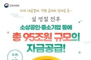 한국사회적경제신문 claire-shin 기자 | 자재 대금결제, 직원 급여와 상여금 등… 설 명절 전후 소상공인·중소기업 등에 총 95조 원 규모의 자금공급! (2.14.~2.18.) - 중소·중견기업 ■ 특별대출, 보증 · 지원기간: ~3.5. · 신청방법: 산업은행, 기업은행, 신용보증기금 지점 상담 - 중소기업·소상공인 ■ 거래 기여도, 신용등급에 따라 은행권 금리우대 대출 · 지원기간: ~3.13. *4대 시중은행 기준(타 은행은 보도자료 참고) · 신청방법: 은행 영업점 방문→설 명절 특별자금지원 상담 - 전통시장 상인 ■ 명절 자금 지원 · 내용 : 연 4.5% 이내 금리 / 최대 1000만 원 대출 · 지원기간: ~2.13. · 신청방법: 우수시장(기초지자체 추천) 소속 상인이 상인회에 신청