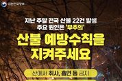한국사회적경제신문 claire-shin 기자 | 지난 주말 전국 산불 22건 발생 주요 원인은 '부주의' 산불 예방수칙을 지켜주세요 · 산에서 취사, 흡연 등 금지 · 산 근처에서 쓰레기 소각 금지 · 연기, 불씨 보면 119 신고 "불법소각, 꽁초 투기 등 위반 행위 엄정 대응"