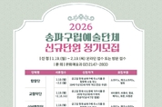 문화예술의 도시 송파, 구립문화예술단체 신규단원 공개 모집 (사진) 단체공연 및 극단사진 ‘문화예술의 도시’로 자리매김한 **송파구**가 지역 문화예술의 저변을 넓히기 위해 구립문화예술단체 신규단원을 공개 모집한다. 서강석 송파구청장은 오는 2월 19일까지 교향악단과 합창단 등 7개 분야에서 새로운 단원을 선발한다고 밝혔다. 송파구는 현재 서울 자치구 가운데 가장 많은 8개의 구립문화예술단체를 운영하고 있다. 교향악단, 합창단, 실버합창단, 실버악단, 민속예술단, 청소년교향악단, 소년소녀합창단, 극단으로 구성돼 있으며, 어린이부터 어르신까지 전 세대가 함께 무대에 오르는 것이 특징이다. 올해 모집 대상은 실버악단을 제외한 7개 단체다. 모집 일정은 단체별로 다르며, 최종 접수 마감은 2월 19일이다. 지원자는 송파구청 홈페이지 고시·공고란에서 자격 요건과 모집 부문을 확인한 뒤, 응시 서류를 이메일로 제출하거나 송파구청 문화예술과를 방문해 접수하면 된다. 선발은 1차 서류 심사와 2차 실기 및 면접을 거쳐 최종 확정된다. 위촉된 단원들에게는 활동 무대가 폭넓게 열려 있다. 한성백제문화제와 석촌호수 벚꽃축제 등 송파구 대표 축제는 물론, 롯데콘서트홀과 송파문화