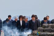 한국사회적경제신문 claire-shin 기자 | 이재명 대통령과 김혜경 여사는29일 오전, 제주 4·3 평화공원을 찾아 영령들께 참배하고 유족들과 함께하는 시간을 가졌다. 이번 방문은 국가기념일인 ‘제주 4·3 희생자 추념일’을 앞두고 이루어진 것으로, 이 대통령 내외는 헌화와 분향을 통해 희생자들의 넋을 기렸다. 이어 이 대통령 내외는 희생자 15,126위의 위패가 모셔진 ‘위패봉안실’과 4·3 당시 행방불명되어 시신조차 찾지 못한 희생자들의 표석이 설치된 ‘행방불명인 표석’을 찾아 희생자들을 추모했다. 이 대통령은 위패봉안실에서 나와 방명록에 ‘제주 4·3을 기억하며 국가폭력의 재발을 막기 위해, 민형사 시효제도를 폐기하겠습니다.“라고 남겼다. 이 대통령이 방명록을 작성하는 모습을 지켜보던 임문철 제주4·3평화재단 이사장을 비롯한 관계자들은 문구를 보고 박수로 호응했다. 참배 이후 이 대통령 내외는 제주 4·3 희생자 유족들과 오찬을 함께하며 아픔을 나누고 위로하는 시간을 가졌다. 오찬 간담회에는 윤호중 행정안전부 장관과 오영훈 제주도지사, 김한규·문대림·위