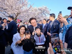 한국사회적경제신문 claire-shin 기자 | 여의도 순복음교회에서 부활절 연합 예배를 마친 이재명 대통령과 김혜경 여사는 여의도 윤중로에 나가 벚꽃놀이를 즐기러 온 시민들과 깜짝 소통에 나섰다. 시민들은 “대통령님, 여사님 파이팅”, “반갑습니다”, “감사합니다”, “여기도 봐주세요!”등을 외치며 이 대통령 부부를 반갑게 맞이했다. 이 대통령 부부는 사진 촬영을 요청하는 시민들과 셀카를 찍으며 인사를 나눴고, 파나마와 중국에서 온 외국인들과도 셀카를 찍었다. 이어 자신을 독립유공자의 딸이라고 밝힌 할머니와 그 손녀와도 함께 사진을 찍기도 했다. 이 대통령은 혼자 오신 어르신께 “어디서 오셨느냐?”고 친근하게 말을 건네고, 유모차를 탄 아이나 어린이와 눈높이를 맞추기 위해 무릎을 굽혀 셀카를 찍는 등 특유의 친근함으로 시민들과 눈높이 소통에 나섰다. 어린 아이를 안고 있는 젊은 부부나 신혼부부들의 사진 요청을 유독 반긴 이 대통령은 "신혼부부가 정말 중요하다"고 크게 웃으며 강조했다. 한편, 엄마와 함께 온 한 어린이가 “대통령 할아버지 사진 찍어주세요!” 라고 외치자 대통령실의 한