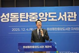 한국사회적경제신문 기자 | 화성특례시가 4일 화성동탄중앙도서관 2층 지식의 숲에서 개관식을 열고 새로운 지식문화 플랫폼의 출발을 알렸다. 지난달 3일 문을 연 화성동탄중앙도서관은 한 달여간의 운영을 통해 안정적인 서비스 기반을 갖춰왔으며, 이날 개관식은 지역 커뮤니티 중심 공간으로서의 역할을 본격적으로 확장하기 위해 마련됐다. 개관식에는 정명근 화성특례시장, 배정수 화성특례시의회 의장, 관내 교육기관 및 도서관 관계자, 주민 등 250여 명이 참석해 도서관의 개관을 함께 축하하고 향후 운영 방향을 공유했다. 개관식은 동탄 청계동 소재 어린이합창단 ‘싱잉엔젤스’의 축하공연으로 막을 올렸으며, 도서관 시설 안내 영상, 사업 경과 보고, 기념사 및 축사, 기념 퍼포먼스, 어린이 시 낭송 등이 진행됐다. 부대행사로는 ▲정조대왕과 화성시 대표 캐릭터‘코리요’ 활용한 북큐레이션 및 전시 ▲인공지능(AI) 안내로봇 체험 ▲인공지능(AI) 포토부스 ▲나만의 그림책 만들기 ▲캘리그라피 ▲미니어처 전시 등 가족과 어린이가 함께 즐길 수 있는 콘텐츠가 운영됐다. 시는 개관식과 연계해 12월 한 달간 ‘개