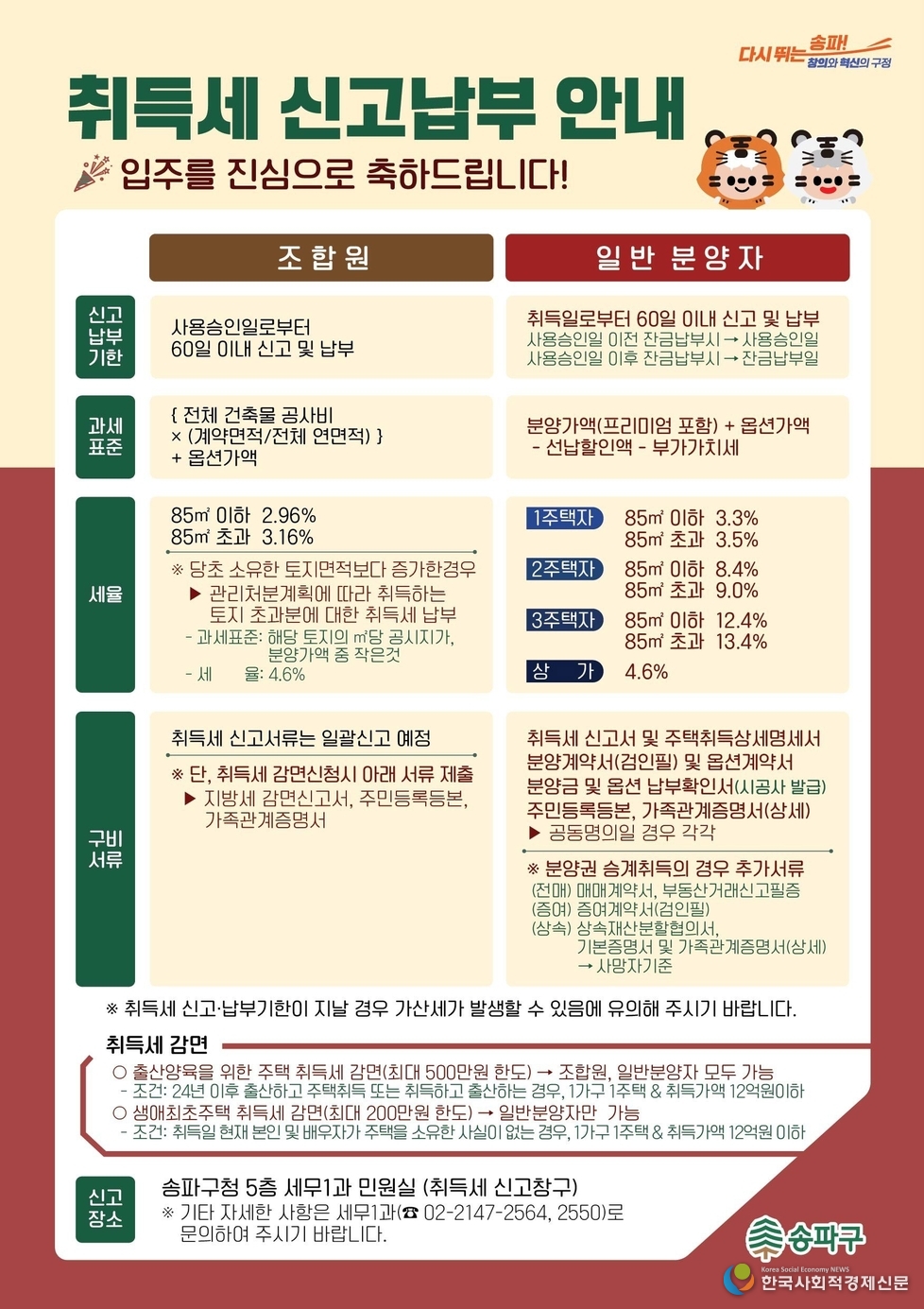 서강석 송파구청장은 “대규모 입주를 앞두고 세금 문제로 고민이 많을 것으로 안다”며 “신고·납부 기한을 놓쳐 재산상 피해를 보는 구민이 없도록 선제적으로 안내하고 있다”고 말했다. 이어 “모든 구민이 만족할 수 있는 양질의 행정서비스를 제공하기 위해 적극행정을 지속하겠다”고 밝혔다.