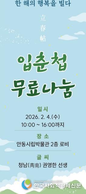 한국사회적경제신문 기자 | 안동시립박물관은 2026년 입춘을 맞아, 박물관을 찾는 관람객들을 대상으로 ‘입춘첩(立春帖)’ 무료 나눔 행사를 2월 4일 오전 10시부터 오후 4시까지 진행한다.