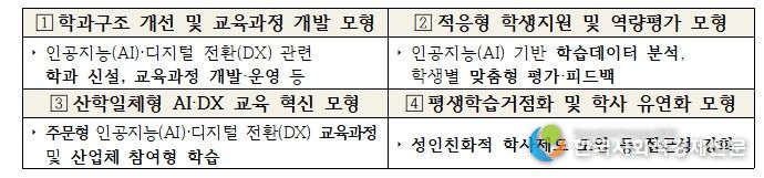 교육부는 2026년 신규 사업 공모를 통해 총 24개 내외 사업단(전문대학)을 선정하여 사업단별 최대 10억 원(총 240억 원)을 지원할 예정이다. 주요 추진 내용으로는 ▲인공지능(AI)·디지털 전환(DX) 환경 조성, ▲재학생·교직원·지역주민 맞춤형 인공지능(AI) 역량 강화, ▲대학별 특화모형 구축이 있다.